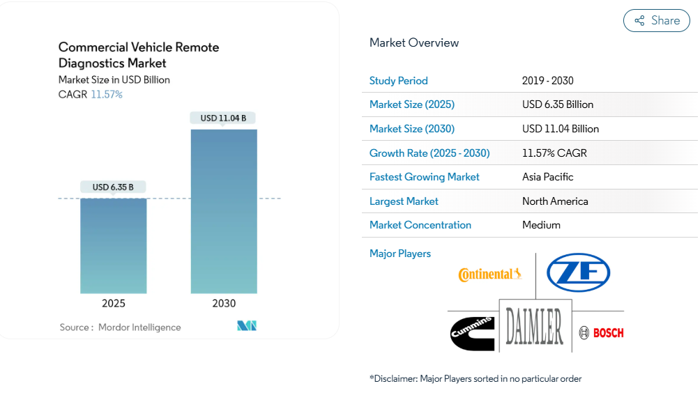 商用車リモート診断市場は、2025年に63億5,000万米ドルと評価され、2030年までに110億4,000万米ドルに達する見込みです。予測期間(2025-2030年)において、年平均成長率(CAGR)11.57%で拡大を続けています。世界中のフリート運営者は、排出ガス規制の強化、5G対応のエッジ分析、慢性的なドライバー不足といった状況下において、稼働時間重視の運用が重要であるため、リアルタイムの健康状態監視を不可欠と捉えています。