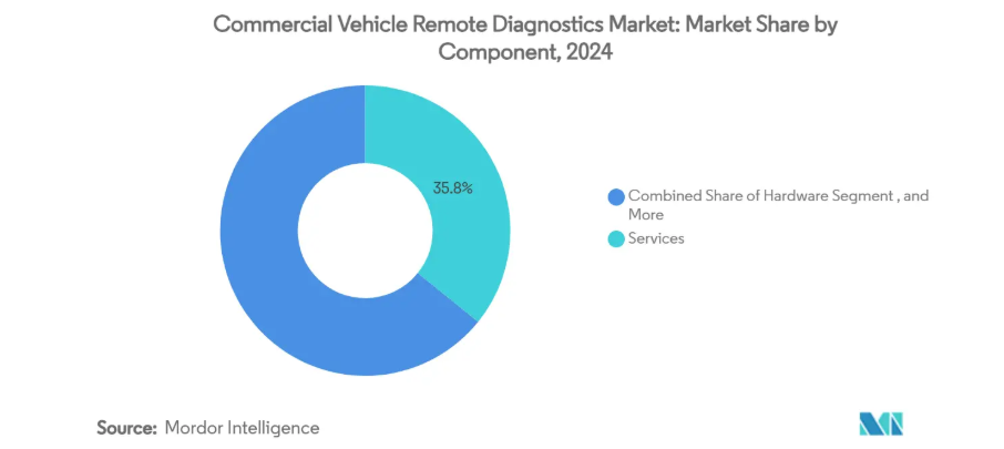 サービスは2024年時点で商用車遠隔診断市場の最大シェア(35.80%)を維持しており、ソフトウェアソリューションの急成長は、診断機能の提供方法と利用方法における根本的な変革を示しています。ソフトウェアは2030年までに18.70%のCAGRで成長する最も急成長しているコンポーネントセグメントであり、クラウドベースの診断プラットフォームやAI駆動型予測分析への業界の加速的な移行を反映しています。ECU、センサー、テレマティクス制御ユニットなどのハードウェアコンポーネントは、データ収集のための基盤インフラを提供し続けていますが、その成長は単独のデバイス販売よりもソフトウェア機能にますます依存しています。エッジAIゲートウェイは特に活況を呈するハードウェアサブセグメントであり、リアルタイム処理機能により重要診断機能の遅延と帯域幅要件を低減します。