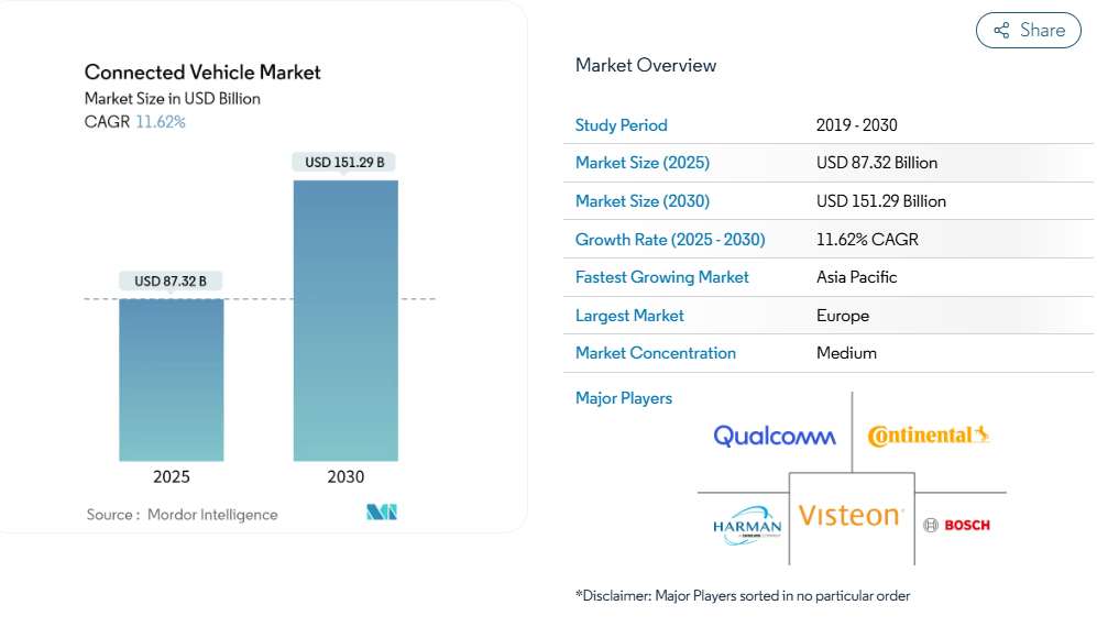 コネクテッドカー市場は中程度の分散状態にあります。ハーマンがゼネラルモーターズの「2024年度サプライヤー・オブ・ザ・イヤー」に選出されたことは、OEM戦略におけるソフトウェア専門企業の重要性が高まっていることを示しています。クアルコムとアマゾンの共同取り組みであるSnapdragon CockpitとAWSクラウドサービスの融合は、開発サイクルの短縮とAIを活用したユーザー体験の組み込みを目指しています。