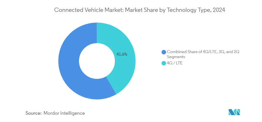 2024年時点のコネクテッドカー市場規模において、4G/LTEネットワークは41.62%を占めました。これは、基本的なテレマティクスやインフォテインメント機能に成熟した低コストモデムを依然として依存する大衆市場モデルを支える基盤となっています。レガシーな3Gおよび2Gモジュールは、アフターマーケットやコスト重視のグレードに依然として存在しますが、その衰退は加速しています。これは、ほとんどの規制当局が現在、帯域幅を大量に消費する安全機能を要求しており、旧規格では対応できないためです。クアルコムのSnapdragon Digital Chassisは、5Gモデム、高性能CPU、GPUを単一の自動車グレードパッケージに統合し、部品表を簡素化しながら車線レベルの位置測位、高精細地図ストリーミング、100ミリ秒未満のV2X遅延を実現します。自動車メーカーは、このチップセットをボッシュやコンチネンタルなどの主要メーカーのドメインコントローラーと組み合わせ、販売後に有効化可能なソフトウェア定義機能をサポートし、製品計画をサブスクリプション収益目標に整合させています。
