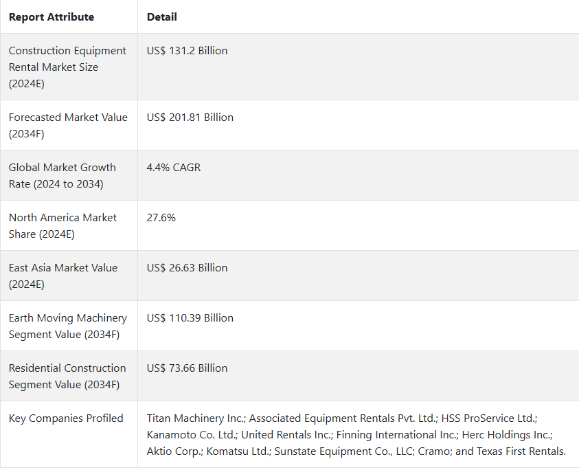 建設機械レンタルの需要は2034年まで年平均成長率4.4%で増加すると計算される。