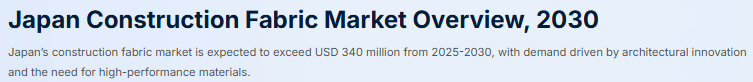 Bonafide Research社の調査レポート「日本の建設用織物市場の概要、2030年」によると、日本の建設用織物市場は2025年から2030年にかけて3億4,000万米ドル以上に拡大すると予測されています。日本の建設用織物市場は、その成長に影響を与える様々な主要な推進要因と新たな動向によって形成されています。最も顕著な推進要因の1つは、持続可能性とエネルギー効率の高い建設慣行への注目の高まりです。日本は世界でも有数の環境持続可能性の提唱国であり、建設用繊維市場は省エネルギーと省資源を促進する素材に対する需要の増加から恩恵を受けています。建築用ファブリックは、冷暖房コストの削減、自然採光の強化、断熱性の向上など、エネルギー効率の高い建物に貢献する能力が認められています。持続可能性に加え、日本ではモジュラー工法やプレハブ工法への関心が高まっていることも、こうしたプロジェクトでの建築用繊維の採用につながりました。モジュラー工法やプレハブ工法は、工期、人件費、環境への影響を削減できる可能性があるため、日本では人気が高まっています。このような工法で建設用繊維を使用すれば、材料の取り扱い、輸送、設置が容易になるため、建設プロセスの合理化に役立ちます。さらに、建設用ファブリックの製造に使用される技術の進歩により、その機能性が大幅に向上しました。これらの素材は耐久性、耐候性に優れ、断熱性やUVカット性能も向上しているため、住宅用から大規模なインフラプロジェクトまで、さまざまな用途に最適です。また、日本の建築用ファブリック市場では、カスタマイズの需要が高まっており、建築家や建設業者は、プロジェクトの特定の要件を満たすために、独自のオーダーメイドのソリューションを求めています。