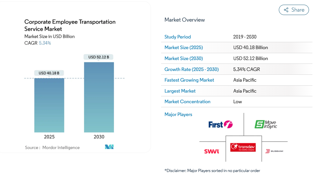 自動運転シャトルの商業サービス導入、ゼロエミッション車両に対する政府支援の拡大、および地方都市における交通渋滞の深刻化が相まって、市場拡大の勢いを後押ししております。競争の激しさは依然として中程度です。これは、分散した地域事業者とともにベンチャー資本によるプラットフォーム事業者が共存している一方、ドライバー不足や保険料高騰に伴うコスト圧力により技術統合が促進されているためです。同時に、雇用主は通勤支援策を戦略的福利厚生と位置付け、多様性・公平性・包摂性(DEI)目標に沿った交通政策を推進することで、従業員の定着率向上と欠勤率低減を図っています。