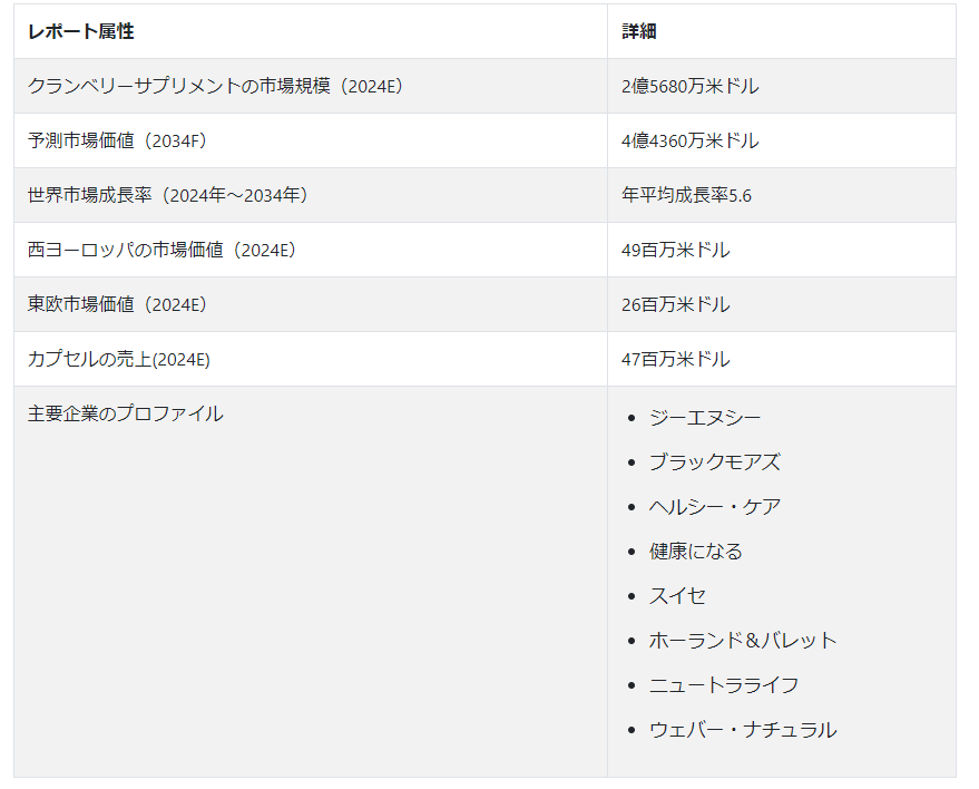 市場調査レポート:クランベリーサプリメント市場の展望(2024〜2034年)~地域別、流通チャネル別、形態別