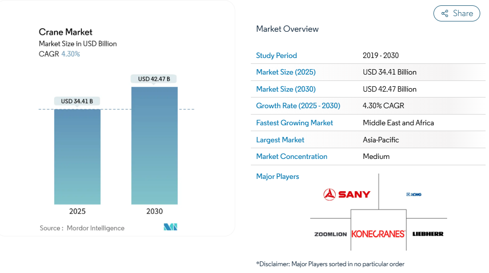 クレーン市場は2025年に344億1,000万米ドルに達し、2030年までに424億7,000万米ドルへ拡大すると予測されており、これは年平均成長率(CAGR)4.30%に相当します。安定した公共支出、大規模な民間メガプロジェクト、そして再生可能エネルギーへの世界的な移行が、クレーン市場の主要な需要原動力となっています。米国インフラ投資・雇用法に代表される政府主導のインフラ事業により、複数年にわたる受注残が発生し、請負業者は短期的な景気変動の影響を受けにくくなっております。