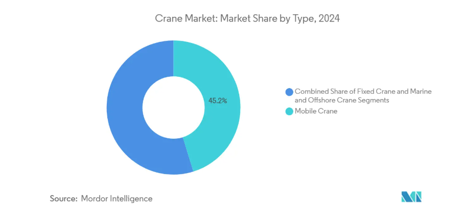 移動式クレーンは2024年に45.25%の最大市場シェアを維持しており、建設・インフラ・産業用途における汎用性を反映しています。移動式クレーンセグメントは、多様な現場への適応性と複数プロジェクトへの迅速な展開能力により、様々な作業負荷を管理する請負業者にとって最適な選択肢となっています。海洋・オフショアクレーンは、2025年から2030年にかけて7.45%のCAGR(年平均成長率)で最も強い成長軌道を示しており、これは前例のない規模の洋上風力発電設備の拡大と、船舶搭載型特殊リフティングソリューションの必要性によって牽引されています。