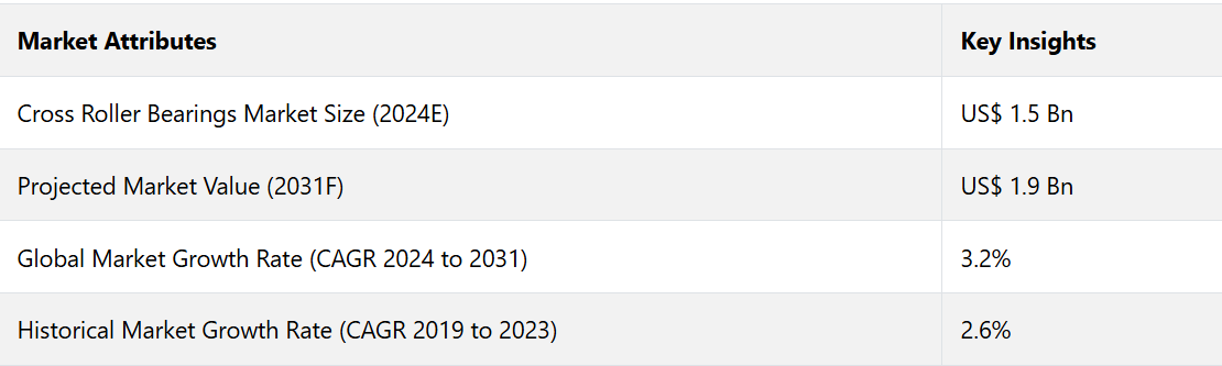 クロスローラベアリング市場は、2024年から2031年の期間に年平均成長率(CAGR)3.2%で成長すると予測されています。2024年に記録された15億米ドルから、2031年には19億米ドルに増加すると予測されています。