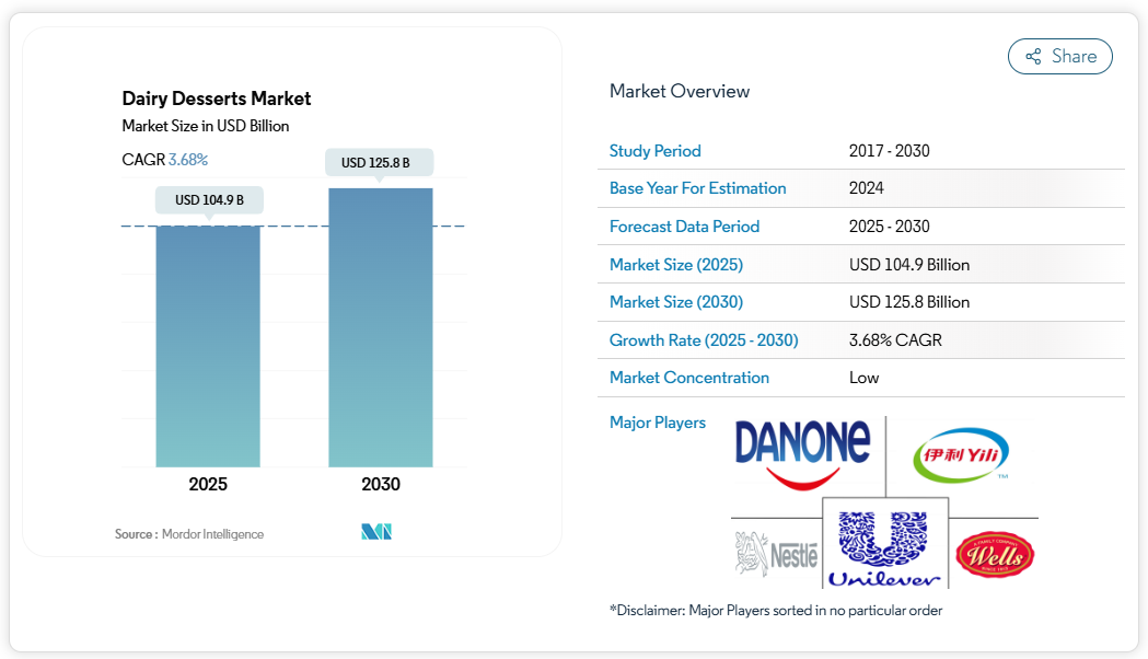 市場シェア拡大を目指す競合企業にとって、ニッチセグメントや未開拓市場への注力は大きな機会となります。成功要因としては、独自の価値提案の開発、効率的なサプライチェーンの確立、強力なブランドアイデンティティの構築が挙げられます。また、原材料の使用、表示要件、持続可能性に関する取り組みなど、規制変更の可能性にも備える必要があります。特に健康やウェルネスに関する消費者の嗜好の変化に適応する能力が重要となるでしょう。持続可能な実践と透明性の高いサプライチェーンへの投資は、市場における競争優位性を維持するためにますます重要となります。さらに、加工乳製品の統合やアイスクリーム製品の革新は、デザート産業のさらなる成長を促進する可能性があります。