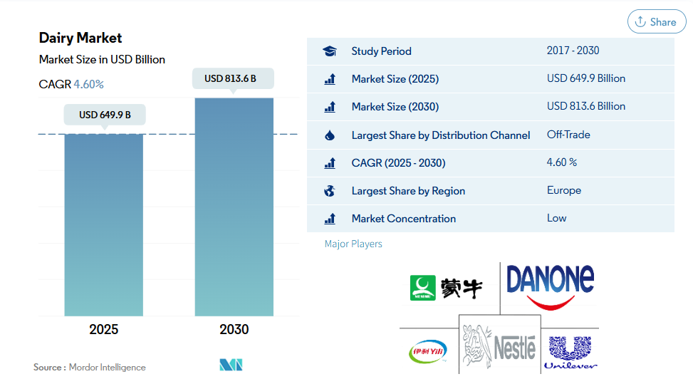 乳製品市場の規模は、2025年に6,499億米ドルと推定されており、2030年までに8,136億米ドルに達すると予測されています。