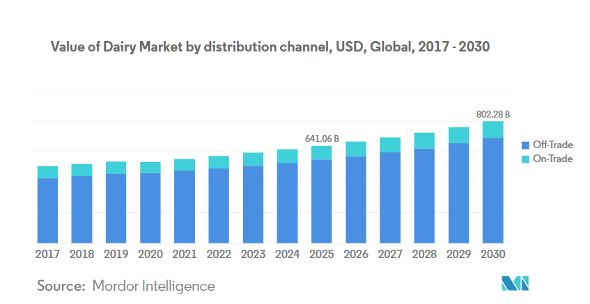 - 外食産業チャネルにおける乳製品ベースのレシピ需要の増加が、世界の乳製品市場の成長を促進しています。オントレードチャネルを通じた乳製品の販売は、2022年と比較して2025年に9%の成長が見込まれています。このセグメントの成長は、家庭外で調理された食品の消費に起因しています。2022年には、世界の消費者の47%がレストランで食事を摂取し、31%がフードサービスチャネルから食品を注文しました。