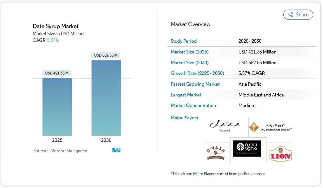 デーツシロップ市場は中程度の集中度を示しており、地域に根差した既存企業と差別化戦略で市場シェアを拡大しようとする新興イノベーターとの間で均衡した競争が展開されています。Al Foah(Agthia Group)のような市場リーダーは産業統合と確立された流通ネットワークを活用しており、Agthiaは2024年上半期に25億3000万ディルハムの収益成長を報告し、この分野における多角化食品企業の財務的強さを示しています。小規模事業者はECプラットフォームやD2C戦略を活用し、既存ブランドと競合しています。一方、デザートバレーデーツのような地域専門企業は、太陽光発電導入などの持続可能性施策を実施し、環境意識の高い消費者層への訴求を図っています。
