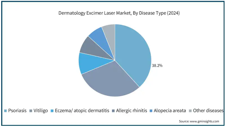 疾患の種類別では、皮膚科エキシマレーザー市場は乾癬、白斑、湿疹/アトピー性皮膚炎、アレルギー性鼻炎、円形脱毛症、その他の疾患に区分されます。乾癬セグメントは2024年に38.2%のシェアを占め、市場を支配。