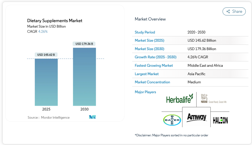 栄養補助食品市場規模は2025年に1,456億2,000万米ドルを記録し、2030年までに1,793億6,000万米ドルに達すると予測されており、年平均成長率(CAGR)4.26%で成長しています。予防医療や健康管理への消費者の関心が高まっていることから、市場は大きな変革期を迎えています。