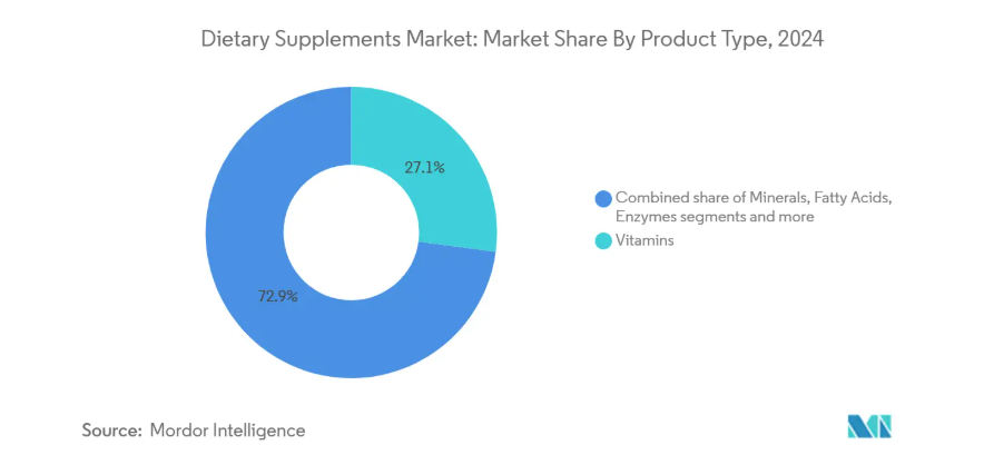 2024年時点で合成・発酵由来サプリメントは市場シェア56.11%を占め、コスト優位性と安定した品質プロファイルにより優位性を維持しています。この分野では、精密な栄養素配合と生体利用率向上のため、先進的な生産技術が活用されています。米国農務省(USDA)報告書によれば、多くのビタミンは遺伝子組み換え微生物を用いた発酵または化学合成により製造されており、同分野の技術的進歩が示されています。しかしながら、合成セグメントは、天然由来代替品を求める消費者需要の高まりと規制監視の強化により、ますます厳しい状況に直面しております。