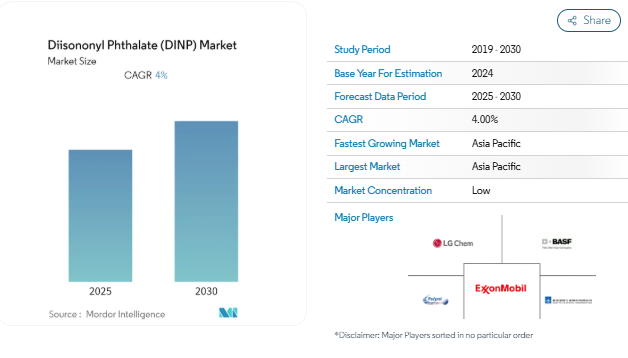 フタル酸ジイソノニル(DINP)市場は予測期間(2025-2030年)にCAGR 4%を記録すると予測されています。
