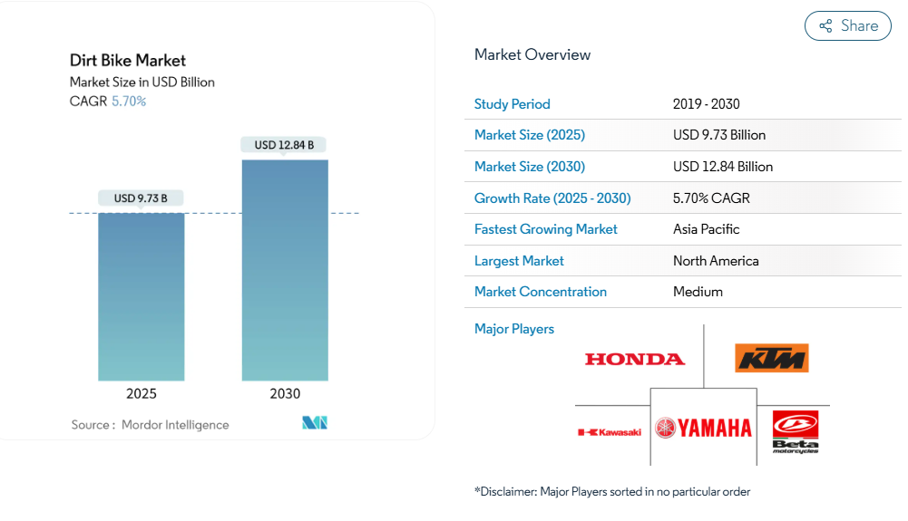 ダートバイク市場は中程度の分散状態ですが、ホンダ、KTM、ヤマハ、カワサキは、豊富な研究開発リソースと認知度の高いファクトリーレースプログラムにより、最大の出荷台数を占めています。ホンダの2025年型CRFは、メインスパーの幅縮小とECUマップの改良により、アマチュアレーサー層における優位性維持に貢献しております。