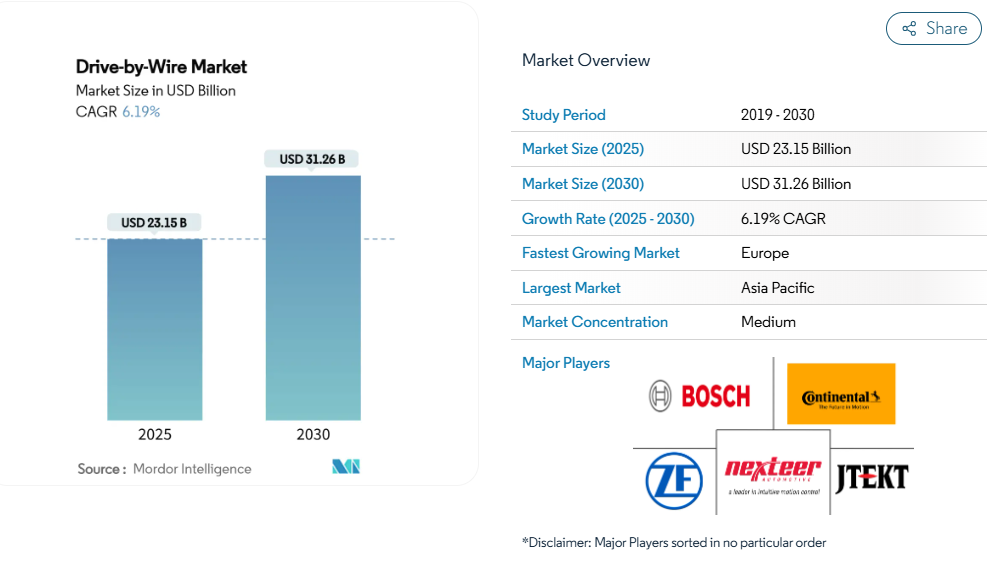 ドライブ・バイ・ワイヤ市場は依然として中程度の分散状態ですが、機能安全とサイバーセキュリティの要求が高まる中、主要企業は技術的ハードルの引き上げに伴いリードを拡大しています。ZF、コンチネンタル、ボッシュの3社は、複数年にわたるブレーキ・バイ・ワイヤおよびステア・バイ・ワイヤの受注を背景に、2024年の世界供給量の3分の1以上を占めました。これらの企業は統合ソフトウェアスタック、検証リグ、クロスドメイン知的財産を活用し、EVおよび自動運転プログラムの継続的な受注を確保しています。