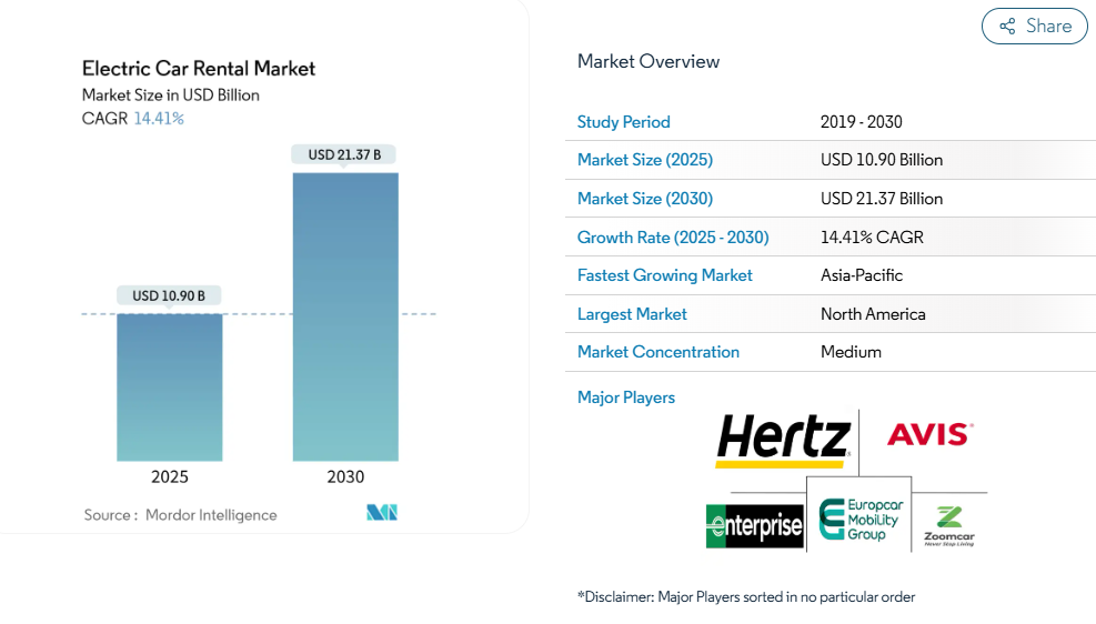 電気自動車レンタル市場は2025年に109億米ドル規模であり、2030年までに213億7000万米ドルに達すると予測されており、これは年平均成長率(CAGR)14.41%に相当します。ガソリン車フリートとの総所有コスト(TCO)の均衡達成、空港充電インフラの急速な拡充、ならびに米国・英国・EU複数加盟国における排出ガスゼロ車両義務化の推進が、この成長を支えています。