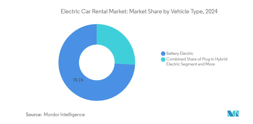 バッテリー電気自動車は2024年に74.13%の市場シェアを獲得し、充電インフラの成熟と政府の規制がレンタルフリート全体での普及を促進する中、2030年まで年平均成長率21.80%で拡大します。プラグインハイブリッド電気自動車(PHEV)は、完全な電気自動車への移行を避けつつ航続距離の柔軟性を求める顧客層に支持され、第二の地位を維持します。延長航続距離電気自動車(REEV)は充電インフラが限られたニッチ用途に対応し、燃料電池電気自動車(FCEV)は特定の運用要件を持つ専門分野で採用されています。BEV技術の優位性は、レンタル事業者が運用簡素化と維持コスト削減を戦略的焦点としていることを反映しています。BEVは可動部品が少なく、ハイブリッドパワートレインよりもサービス上の複雑性が低いという特徴を有します。