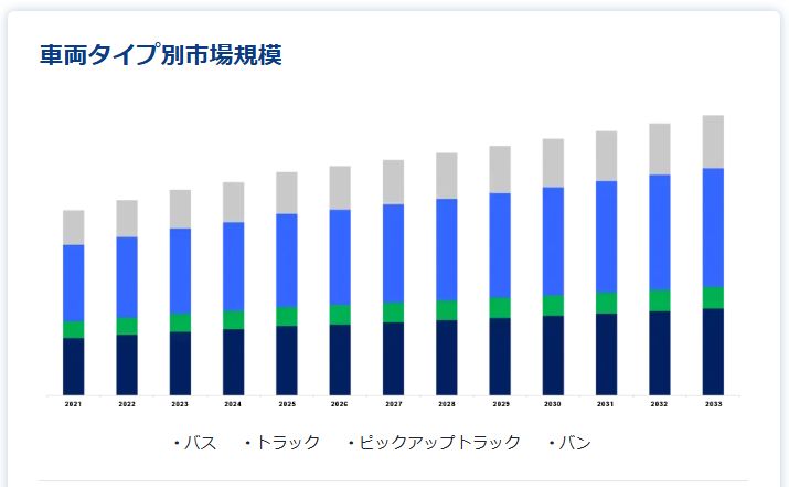 さらに、世界各国の厳しい公害規制により、多くの企業が自動車の電動化を迫られているため、この業界は進展している。 世界各国の政府は、ディーゼル燃料の燃焼によって生じる二酸化炭素の排出を最小限に抑え、温室効果ガスの排出と闘うために、電気自動車の開発に投資するよう自動車メーカーに圧力をかけている。 一方、低排出ガス地帯は、ディーゼル・トラックをよりクリーンなモデルに切り替えるよう、車両隊に働きかけている。 市場は、バッテリー技術の進歩や、ADAS、A.I.、IoTなどの最先端技術の利用拡大により、最新機能を備えた商品を提供することで拡大している。
