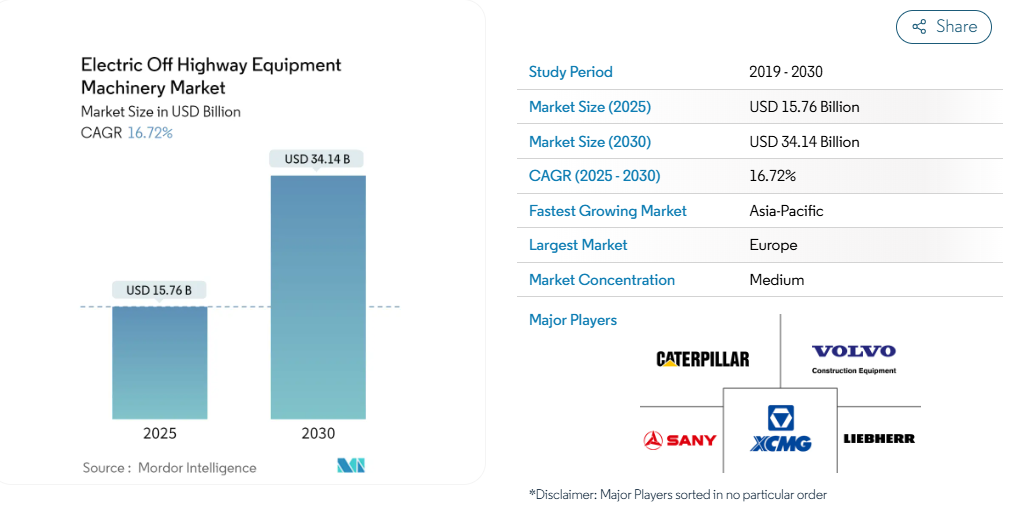 電気式オフハイウェイ機器市場規模は、2025年に157億6,000万米ドルと推定され、予測期間(2025-2030年)において年平均成長率(CAGR)16.72%で推移し、2030年までに341億4,000万米ドルに達すると見込まれております。