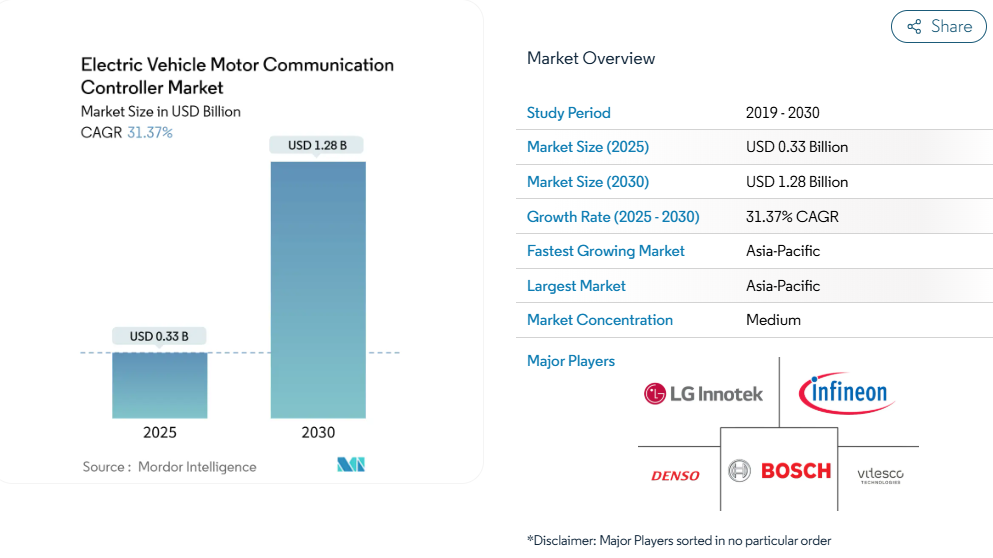 電気自動車用モーター通信コントローラー市場規模は、2025年に3億3,000万米ドルと推定され、予測期間(2025年~2030年)において年平均成長率(CAGR)31.37%で成長し、2030年までに12億8,000万米ドルに達すると見込まれております。