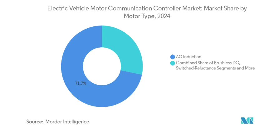 2024年、電気自動車用モーター通信コントローラー市場においてAC誘導モーターが71.65%のシェアを占め、コスト重視セグメントでの地位を確固たるものにしました。しかしながら、34.51%のCAGRで成長するブラシレスDCモーターは、CAN FDの容量を逼迫させる高速センシングと高度な整流アルゴリズムへの需要を喚起しています。