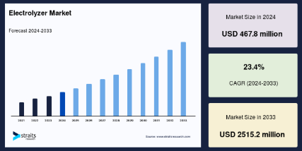世界の電解槽市場規模は2024年に4億6,780万米ドルと評価され、予測期間(2025年から2033年)には25億1,520万米ドルに達し、CAGRは23.4%と予測されています。