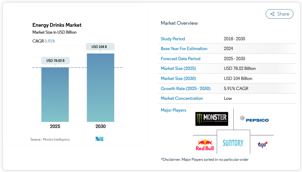 エナジードリンク市場の規模は、2025年に780億2,000万米ドルと推定されており、2030年までに1,040億米ドルに達すると予測されています。予測期間(2025年~2030年)における年平均成長率(CAGR)は5.91%と見込まれています。