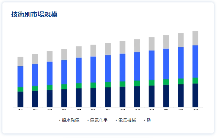 世界のエネルギー貯蔵システム市場(2024年~2033年):技術別、地域別