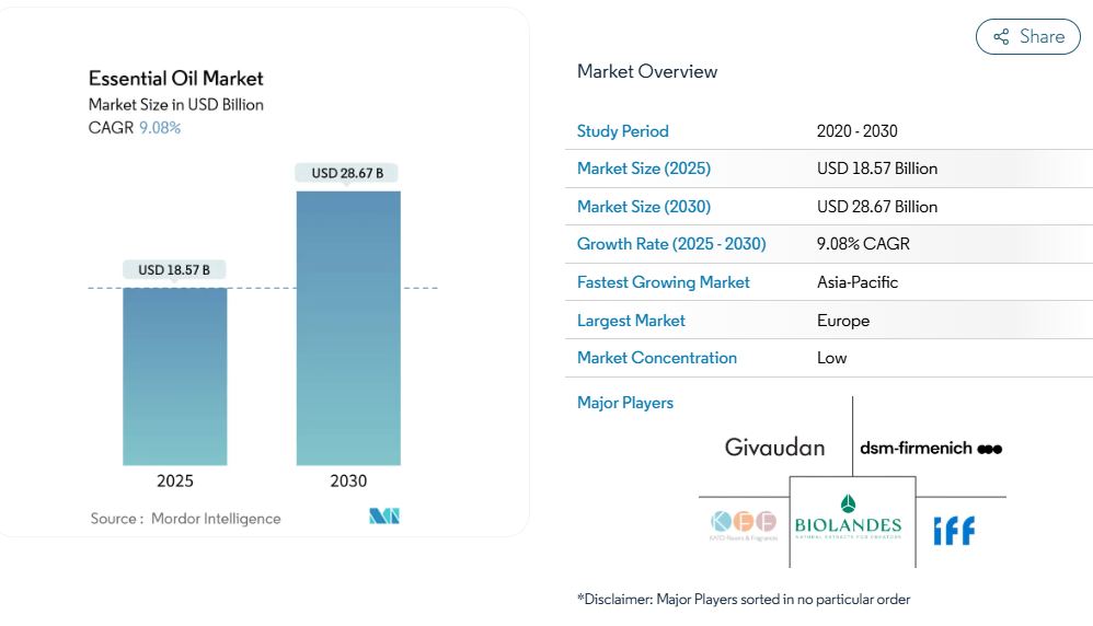 天然精油はサプライチェーンの混乱に直面する一方、合成香料・フレーバー化合物は安定した品質と価格を提供します。先進的な合成生物学技術により、精油のプロファイルを再現しつつ農業サプライチェーンのリスクを低減する、天然物と同一の化合物の生産が可能となりました。供給不足時には、合成代替品は天然精油よりも大幅に低コストとなるため、コスト重視の用途では配合変更が促されます。ただし、EU規制では合成香料のより厳格な表示が義務付けられており、精油配合製品に優位性が生まれています。市場調査によれば、プレミアムセグメントでは高価格にもかかわらず天然原料が引き続き好まれており、コスト重視用途とプレミアム用途の明確な市場分化が示されています。精油メーカーは、特に合成技術の進歩とコスト効率の向上が続く中、供給不足時に顧客が合成代替品へ移行するのを防ぐため、信頼性が高く安定した供給を維持する必要があります。