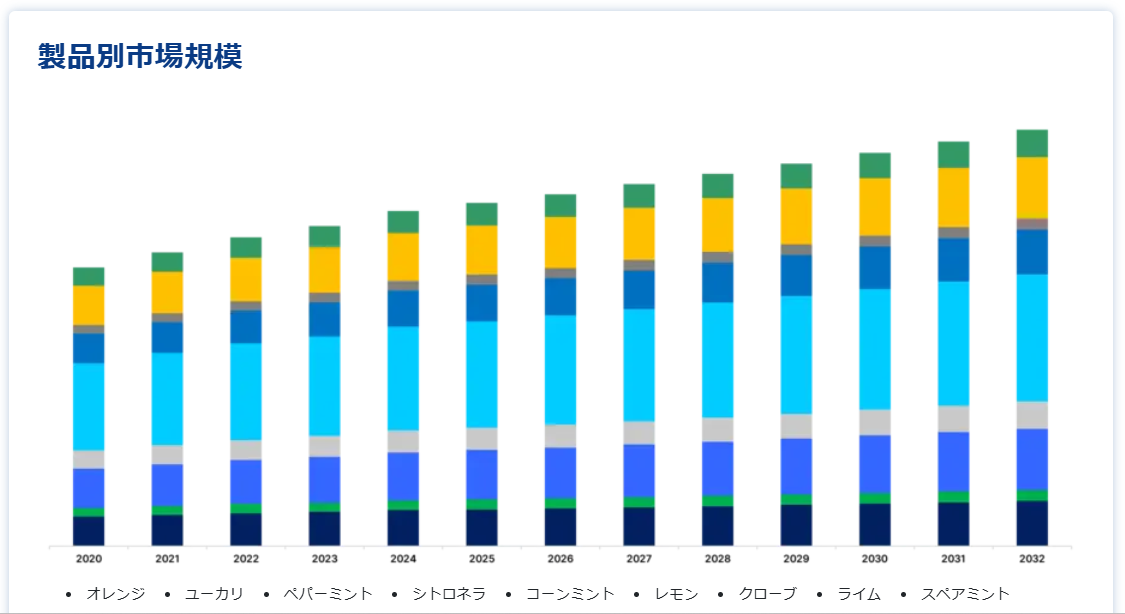 エッセンシャルオイルは、揮発性オイル、エーテルオイル、エーテル油としても知られ、植物の葉、茎、花、樹皮、根、その他の部分から抽出される。 オレンジ、ユーカリ、コーンミント、ペパーミント、シトロネラ、レモン、ライム、クローブ、スペアミントなど、さまざまなハーブや植物を水蒸気と水を使って蒸留し、エッセンシャルオイルを生成する。 これらのオイルには、揮発性の芳香成分と本物の植物エッセンスが含まれている。 主に、エッセンシャルオイルは化粧品やトイレタリー、食品、飲料に利用されている。 化粧品、食品、その他の製品カテゴリーを問わず、ナチュラルでオーガニックな製品に対する消費者の嗜好の高まりが、市場拡大を促す主な要因となっている。 これを受けて、これらの業界で事業を展開するメーカーは、天然添加物を使用した製品を開発してきた。 急速な工業化、可処分所得の増加、新興国における生活水準の向上といった要因に加え、様々なエンドユーザー産業によるエッセンシャルオイルの使用増加が市場の拡大に寄与している。
