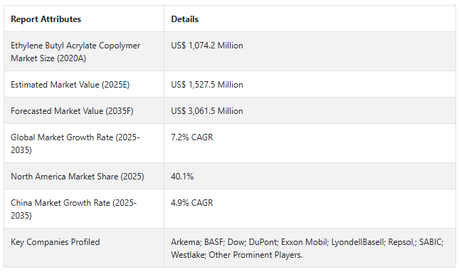 市場調査および競合情報を提供するFact.MRによると、前述の事実を背景に、エチレンブチルアクリレートコポリマー市場は、2025年から2035年までの予測期間中にCAGR 7.2%で成長すると予測されています。