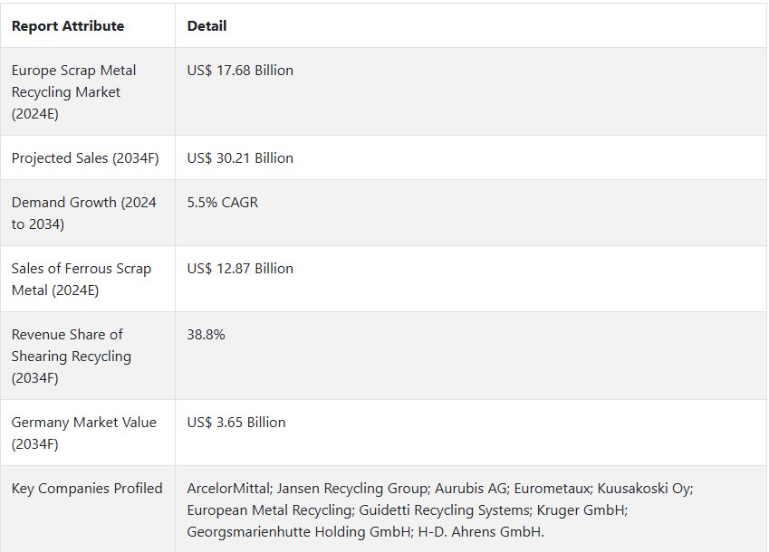 Fact.MRが発行した最新業界レポートによると、ヨーロッパの金属スクラップリサイクルサービスの収益は2024年に176.8億ドルに達すると評価されている。 市場は5.5%のCAGRで上昇し、2034年末までに302.1億ドルに達すると予測されている。