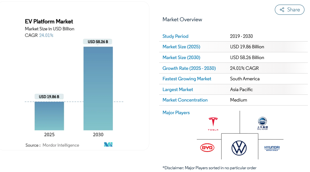市場集中度は中程度であり、既存OEMメーカーが受託製造業者や技術革新企業と市場を共有しています。テスラの初期段階におけるスケートボードプラットフォームの優位性は、BYDの百万台規模の生産量と垂直統合型バッテリー供給体制と対峙しています。フォルクスワーゲンがリビアンに50億米ドルを出資したことは、既存メーカーがソフトウェア優先プラットフォームへの参入を表明したことを示しています。マグナはフィスカーやメルセデスEQモデル向けに車体下部を供給し、「受託製造」の軌道を示しています。フォックスコンはスマートフォン規模の生産力を活用し、オープンEVフレームを提供。新規参入資金が不足するティア2ブランドを誘致しています。