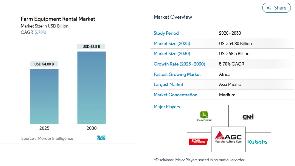 農業機械レンタル市場の規模は、2025年に548億米ドルと推定され、予測期間(2025-2030年)において年平均成長率(CAGR)5.70%で推移し、2030年までに685億米ドルに達すると見込まれております。トラクターに対する安定した需要、デジタルレンタルプラットフォームの急速な成長、および政府による機械化支援プログラムが、この着実な拡大を支えております。