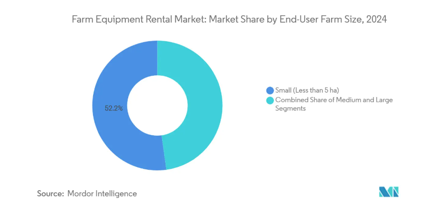 5ヘクタール未満の小規模農場は、レンタルが主要な機械化手段であるため、2024年の収益の52.50%を生み出しました。インドやインドネシアでは政府資金による拠点がトラクター・播種機・脱穀機を補助金付きで一括提供。こうした農地では稼働時間が限られても大幅な労力削減につながります。一方、20ヘクタール以上の大規模農場は2030年までに年平均成長率6.50%と最も急速に拡大。所有車両を戦略的に補完し、労働力不足を解消、あるいは全面的な更新を伴わずに新興の電動・自律型モデルを試験導入するためレンタルを活用するからです。中規模農場(5~20ヘクタール)は二重戦略を採用し、主要な耕起トラクターは保有しつつ、収穫機や散布機は外部委託することで資本集約度を均衡させています。