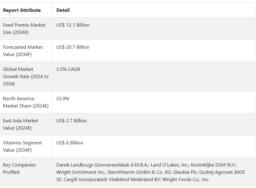 市場調査レポート:飼料用プレミックスの成長予測~セグメント分析、市場規模、シェア2024-2034年
