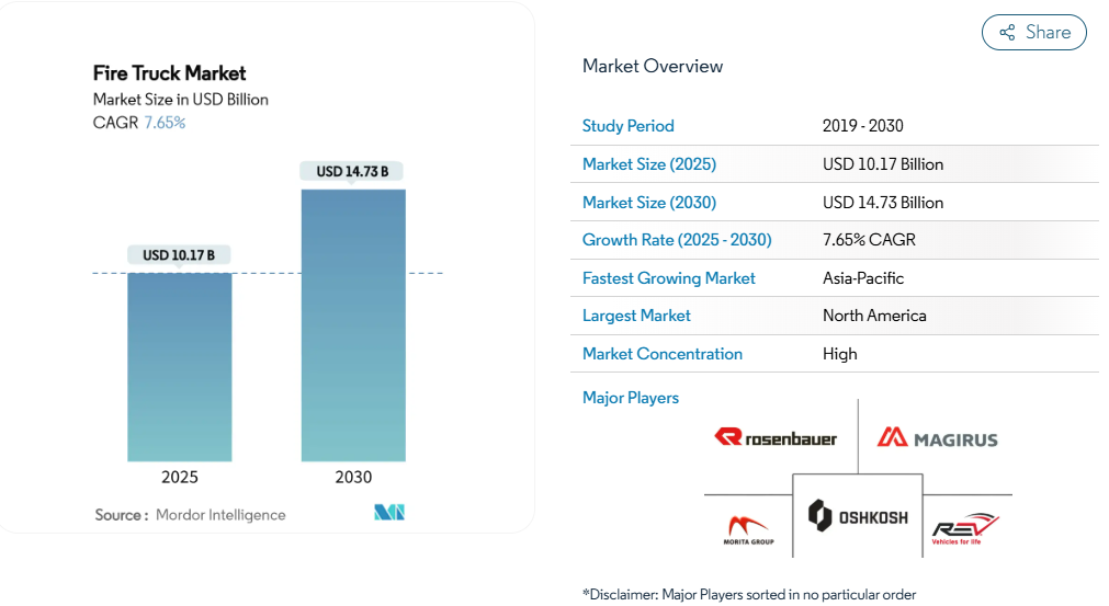 消防車市場の規模は、2025年に101億7,000万米ドルと推定され、予測期間(2025-2030年)において年平均成長率(CAGR)7.65%で推移し、2030年までに147億3,000万米ドルに達すると見込まれております。供給網のボトルネックが継続する中でも、車両更新サイクル、電動化の進展、気候変動に伴う山火事リスクの高まりが相まって、調達予算は増加傾向にあります。18~33ヶ月に及ぶ長い納期により、消防部門は新規納入を待つ間、整備プログラムの近代化を迫られています。