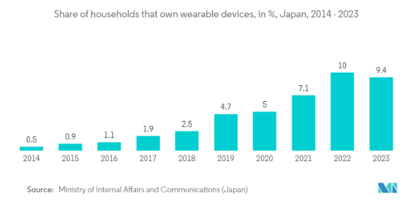 • 例えば、日本の総務省のデータによると、2023年の日本のウェアラブル端末の世帯普及率は9.4%に達しています。これは前年から低下したとはいえ、現在の普及率は2010年代半ばの水準を上回っています。