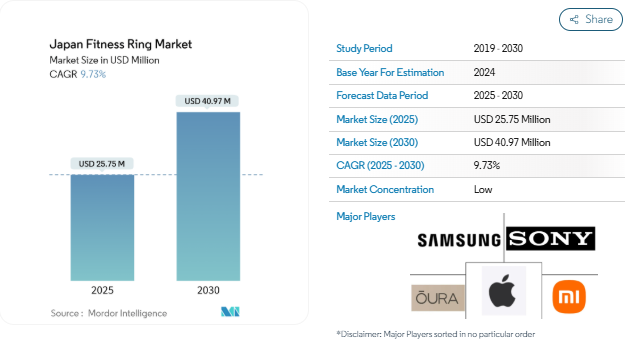 Oura Health Ltd.、Sony Corporation、Xiaomi Corporation、Apple Inc.、Samsung Electronics Co. Ltd.が、日本フィットネスリング市場で事業を展開している主要企業です。