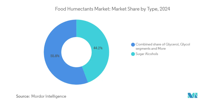 糖質削減への関心の高まりは、保湿剤の選定に大きな変化をもたらしています。メーカーは、甘味と保湿の両機能を兼ね備えた原料を優先的に採用しているからです。ロケット社のLYCASIN 80/55マルチトールシロップは、この傾向を体現する製品です。無糖甘味料かつ保湿剤として機能すると同時に、菓子用途における結晶化を効果的に防止します。この開発は、高糖分摂取に伴う健康リスクに対する消費者の意識向上と合致しており、約3分の2の消費者が積極的に糖分摂取量の削減を模索しています。イノベーションの領域は従来型の糖アルコールを超え、アルロースやタガトースなどの天然代替品へと拡大しています。これらの代替品は優れた保湿性を提供するだけでなく、クリーンラベルの要求にも合致し、健康志向の消費者層に訴求します。規制面での進展もこの変化を後押ししており、FDAが特定の保湿剤を食物繊維として認定したことで、メーカーにとって新たなマーケティング機会が生まれています。