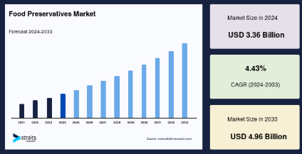 食品保存剤の世界市場規模は、2024年に33億6000万米ドルと評価され、予測期間(2025-2033年)のCAGRは4.43%を示し、2025年の35億米ドルから 2033年には49億6000万米ドルに達すると予測されています。