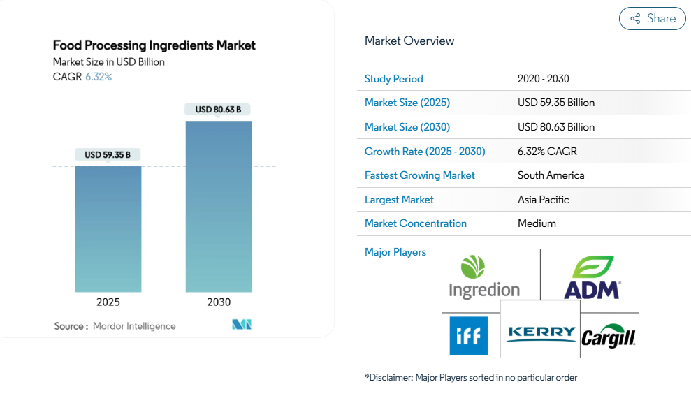 世界の食品加工用原料市場:でんぷん・増粘剤、タンパク質、酵素、その他(2025年~2030年)
