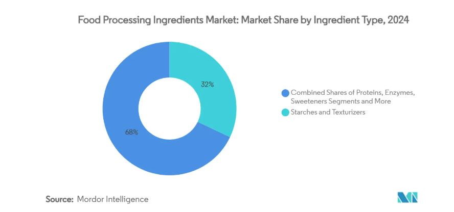 澱粉およびテクスチャライザーは、2024年に32.04%という大きなシェアで市場を支配しています。この顕著な存在感は、ベーカリー製品から加工食品に至るまで、数多くの食品・飲料用途において食品の構造と食感を決定づける上で、これらの原料が極めて重要であることに起因しています。製品品質と消費者の受容性を維持しようとするメーカーにとって、これらの原料は依然として不可欠です。