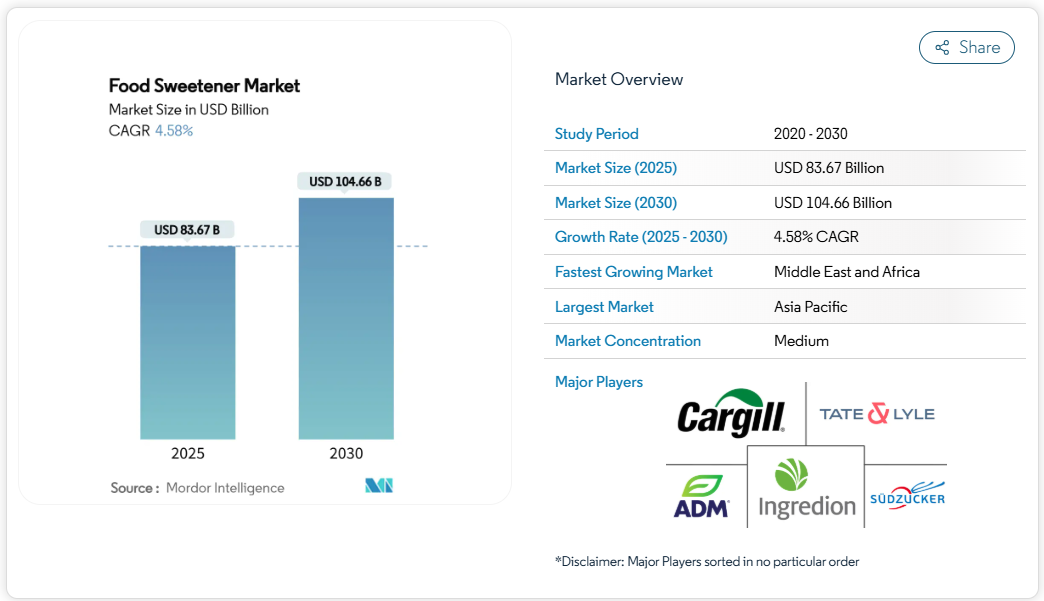 テート・ライル社のような企業は、バイオテクノロジーの進歩を活用し、機能性を高めた植物由来の甘味料を開発しています。例えば、ピュアサークル社は、天然甘味料にしばしば伴う後味の残りを解消する次世代ステビア製品を開発しました。一方、テート・ライル社は甘味料としての機能に加え、腸内環境改善などの健康効果を提供する水溶性食物繊維を導入しました。こうした既存大手と革新的な新規参入者とのダイナミックな相互作用が、均衡を保ちつつ競争的な環境を育み、食品甘味料市場全体の成長と多様化を推進しています。