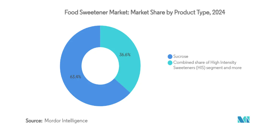 産業統合に加え、各社は変化する消費者ニーズに応えるためイノベーションを推進しています。ステビアなどの天然素材と、アルロースのような発酵由来成分を組み合わせたハイブリッド甘味料システムの開発が進められています。これらのシステムは、コスト効率の向上、味の改善、栄養プロファイルの最適化を目的としています。例えばカーギルの「エバースイート」は、発酵により製造されるステビアベースの甘味料で、カロリーを伴わずに砂糖のような甘さを提供できる点で注目を集めています。同様にADMは、人工添加物を避けながら糖分を減らすソリューションを提供する、クリーンラベル製品への需要増加に対応した甘味料ブレンドを導入しています。こうした革新は、味や食感を維持することが重要な飲料、焼き菓子、乳製品などの用途において特に価値があります。競争環境では、小規模な企業やスタートアップが専門分野に焦点を当て、差別化を図っています。
