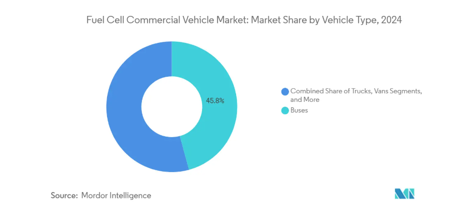 バスは2024年、水素燃料電池商用車市場シェアの45.76%を占めました。これは交通機関が専用資金を活用し、老朽化したディーゼル車両の置き換えを進めたためです。欧州の燃料電池バス登録台数の65%をソラリスが占め、デポベースの運用に特化したOEMの優位性を反映しています。オレンジ郡交通局による40台のFCEB(燃料電池バス)発注など、同セグメントの勢いが確認できます。予測可能な運行ルートと車庫帰還型燃料補給という特性が、350バールの圧縮ガスシステムに適応し、保守チームの日常業務を簡素化することで、この勢いが後押しされています。車両と燃料供給契約をセットにした調達枠組みは、公共部門の買い手にとって予算の確実性をさらに高めます。