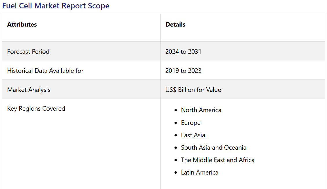 このような革新的な戦略は、予測期間中に燃料電池の需要を促進するものと見込まれています。世界市場は、2024年から2031年の予測期間中に年平均成長率(CAGR)20.5%を記録すると推定されています。