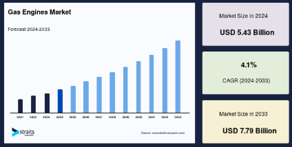 ガスエンジンの世界市場は、2024年に54億3,000万米ドル、2025年には56億5,000万米ドル、2033年には77億9,000万米ドルに達すると予測されています。この期間中の年平均成長率は4.10%と見込まれています。ガスエンジンは、低排出ガス、高効率、低メンテナンスコストといった特徴を持ち、クリーンで効率的な発電技術に対する需要の増加や、分散型発電システムの利用拡大、排出規制の強化が市場を牽引しています。さまざまなガス燃料で運転可能なガスエンジンは、遠隔地や非電化地域でも信頼性の高い電力供給を実現します。